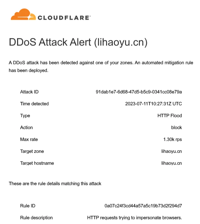 再一看邮箱,好家伙,Cloudflare 直接一口气给我发了 13 封电子邮件,内容全是关于我的网站遭遇 DDoS 攻击的。